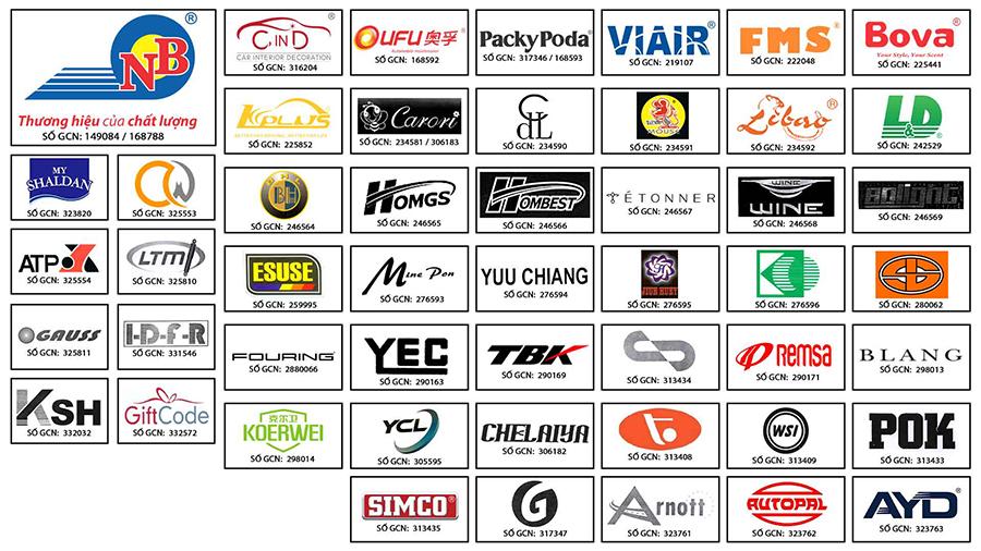 Các nhãn hiệu đăng ký gồm: NAM BAC, CIND, OUFU, PACKYPODA, VIAIR, FMS, BOVA, KPLUS, CARORI, CDL, MOUSE, LIBAO, L&D, MY SHALDAN, CHENG WEI, BHL, HOMGS, HOMBEST, ETONNER, WINE, SOLIGHT, ATP, LTM, ESUSE, MINE PON, YUU CHIANG, JIUH HUEY, K-MOON, SHENG LO, GAUSS, I-D-F-R, FOURING, YEC, TBK, SCHAFERBARTHOLD , REMSA, BLANG, KSH, GIFTCODE, KOERWEI, YCL, CHELAIYA, TANG YANG, WSI, POK, SIMCO, G, ARNOTT, AUTOPAL, AYD.